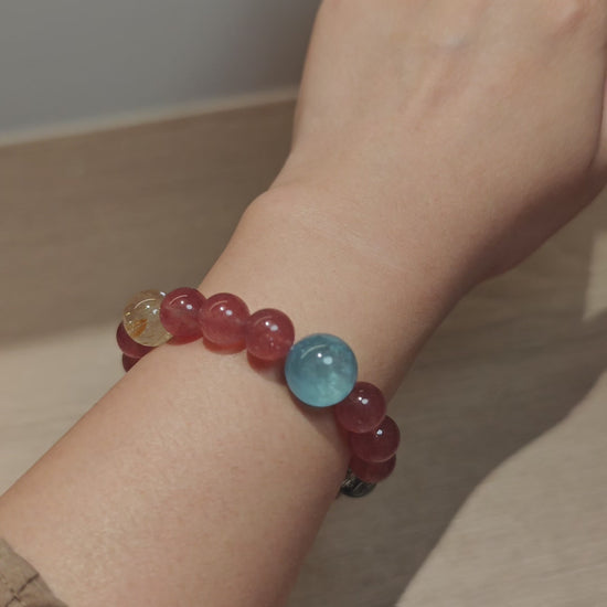 The vibrant hues of strawberry quartz blend seamlessly with the soothing tones of aquamarine and the mystical patterns of white phantom quartz, creating a visually striking yet balanced beaded bracelet design. Ideal for energy healing practices or as a statement accessory, this crystal bracelet piece merges spiritual benefits with timeless elegance.